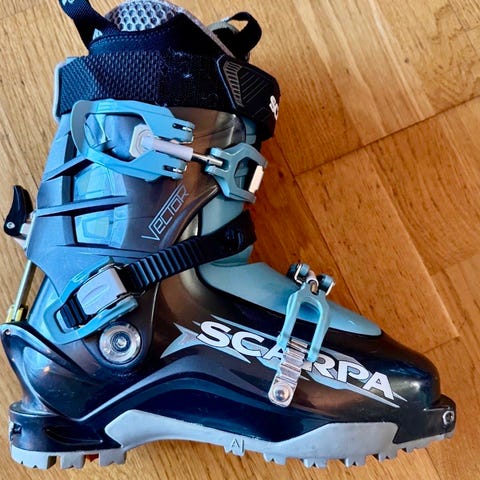 Vector er en 3-spenners skiturstøvel fra Scarpa for kvinner inspirert av Maestrale men lettere, som gjør den behagelig på oppoverturen.