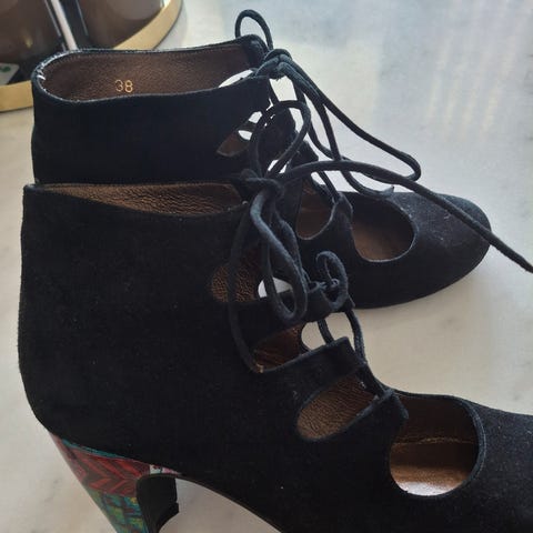 Veldig dyre sko selges svært billig. Har noen småmerker som må børstes og vaskes bort. Semsket skinn