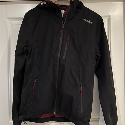 Helly Hansen regntøy jakke i størrelse S for damer. Den har hette med justerbar snor, knapper foran og belte i livet for justerbar passform. Den er brukt men fremstår fint. Noe farge ved åpningen, se bilde.