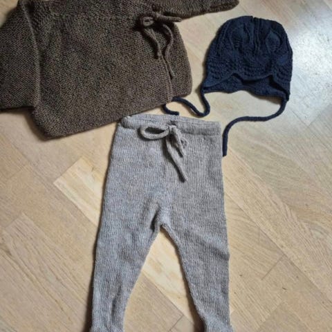 Ellens hentesett fra Petite knit , strikket i myk merinoull. Str. 0-1 mnd. Brukt i forbindelse med hjemreise fra sykehuset