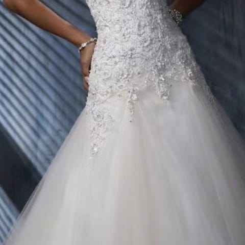 Jeg vurderer å selge bryllupskjolen min. Dette var min absolutte drømmekjole, og den satt som støpt hele kvelden. Høy splitt og drop-shoulders som skredder sydde på (kan tas av med knapper).