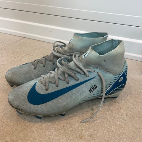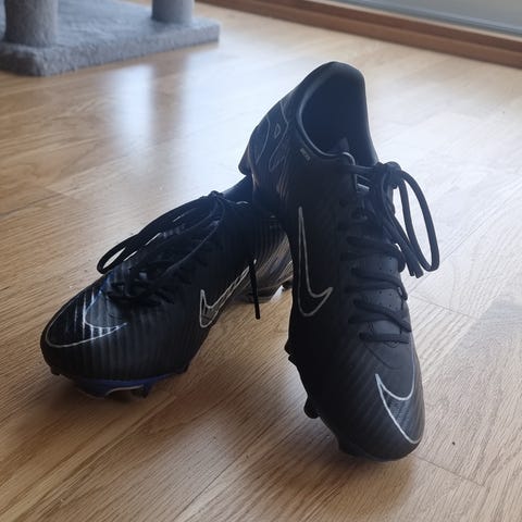 Nike Mercurial fotballsko i størrelse 40,5 Skoene er svarte med hvite og oransje detaljer og har høy ankel for ekstra støtte. Designet for bruk på gressbaner med knotter under sålen.