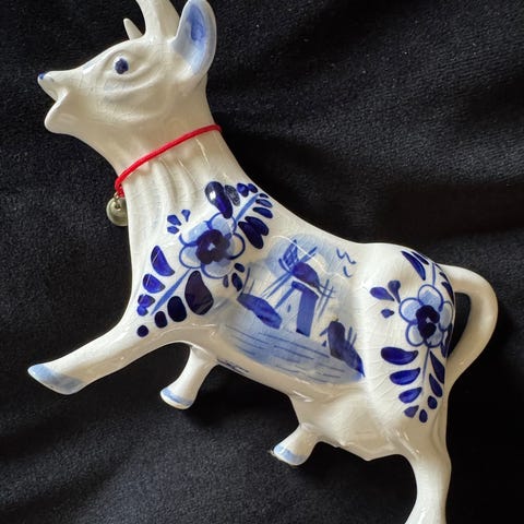 Keramikk melke/fløte mugge formet som en ku, med blå og hvit farge og håndmalt blomsterdekor på siden. Kannen har en høyde på ca. 18 cm og bredde på ca. 16 cm. Egnet for servering av melk/fløte eller andre væsker.