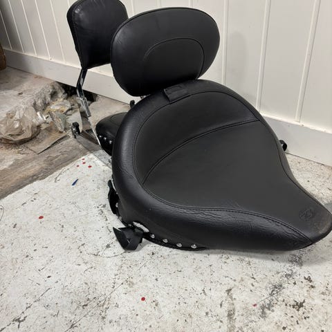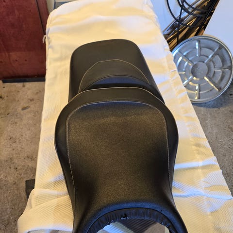 Selger et fint dyna touring sete. Har stått på en 2012 fld, men passer til flere dyna modeller. Se på delenr på bilde. Veldig fint, en liten folderynke på sete, (se bilde) ellers helt fint. Ikke hull/skader. Hentes i stavern eller sendes pr post😌