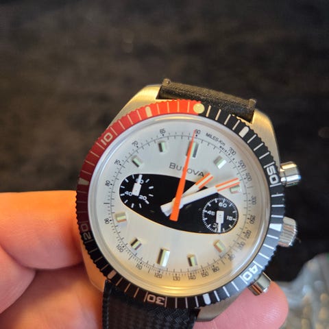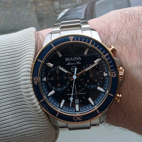 Bulova Marine Star herreklokke med rustfritt stål urkasse og lenke. Klokken har en sølvfarget urskive med kronograf-funksjoner og datovisning. Designet for menn, egnet for daglig bruk og formelle anledninger.