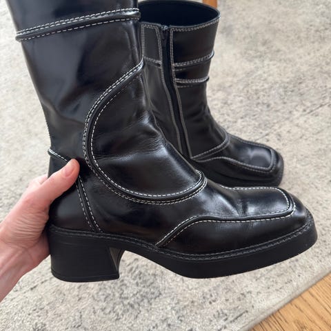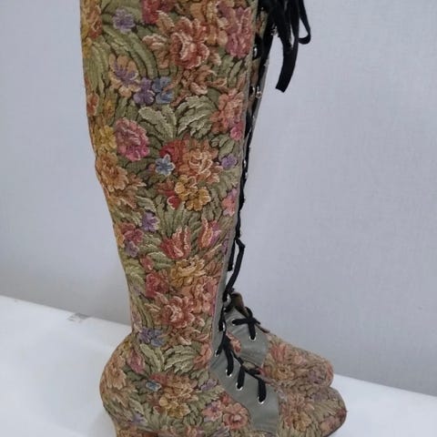 Tøffe platåstøvletter fra 70 eller 80 tallet. Det står ikke størrelse noe sted, men de er 25.5 cm noe som tilsvarer 39 (tror jeg). Mulig de er store i størrelsen da er er altfor store for meg som bruker 38.