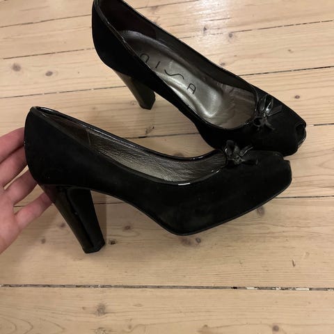 Nydelige sko i sort semsket skinn med åpen tå og sløyfe foran. Ekte skinn. Elegante og behagelige. Selges da jeg dessverre ikke kan bruke hæler lengre.