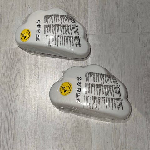 IKEA SKOJIG vegglampe sett bestående av tre deler i form av måne, skjell og en annen skjellform. Lampene er laget i plast og har fargene gul og blå. Lampene er designet for veggmontering og har ledning med bryter.