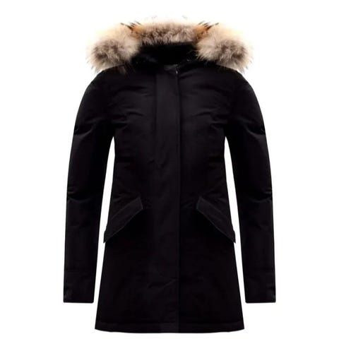Hold deg varm og stilig med denne Woolrich dunjakken for kvinner. Jakken har glidelås- og knappelukking, to frontlommer og en hette i svart, grå og beige farger. Laget av 100% polyesterstoff, fôret med 100% polyester og fylt med 70% grå andedun og 30% fjær. Jakken har også en finish med finsk vaskebjørnpels.