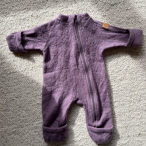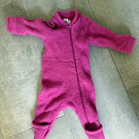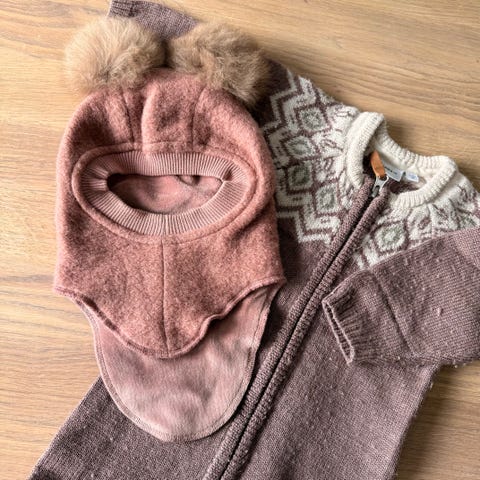 Kløfri overall/heldress i børstet merinoull i str 74/80 med tilhørende balaclava i str 40/42.