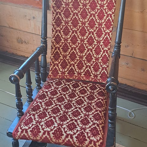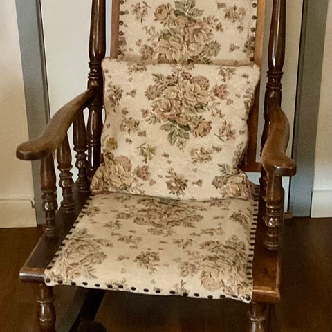 Skjelden antikk gyngestol mulig fra 1800 tallet. Den er sammenleggbar. Ca mål: H 79cm, B 72cm på meiene, setet på det bredeste ca 43cm.