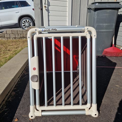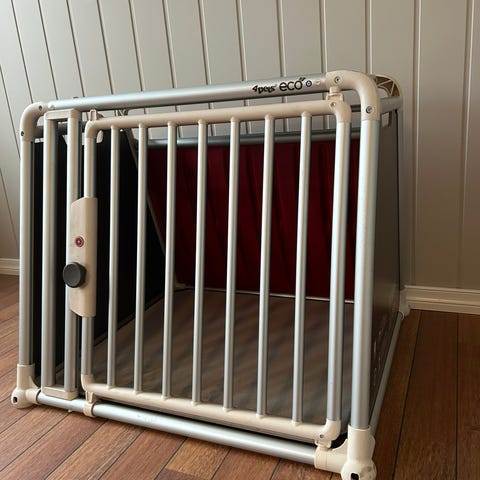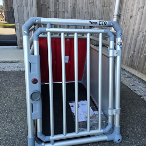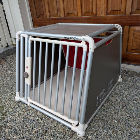 Laget i metall med solide gitterporter. Designet for sikker transport av hunder i bil. Vekt på ca. 18,8 kg, normal belastning 40 kg. Testet og sertifisert av TÜV SÜD for sikkerhet.
