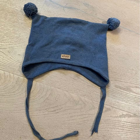 Bomullslue med vindstopper ved ørene, dusker og knyting.