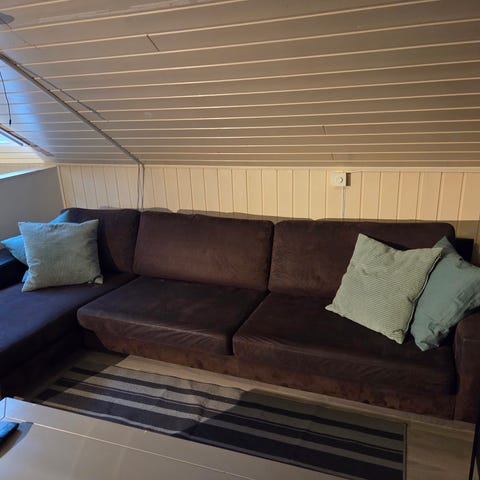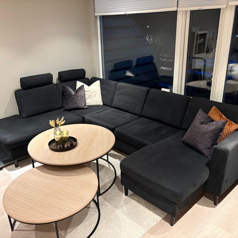 Meget pent brukt hjørnesofa Trevisio fra Bohus, med pall som har oppbevaring. Den har regulerbare nakkestøtte på alle setene, og den kan også reguleres på endene. Korteste side av sofa kan trekkes frem ca 20 cm slik at en får en lounge del. Fargen heter Holzfuss Schwars. Ingen røyk eller dyr