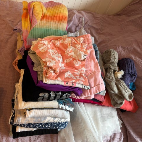 Selger en liten klespakke til jente, passer str 8 år. Kordfløyel skjørt syr 8 år, genser med store armer str 9-10 år, t-skjorte str XS.
