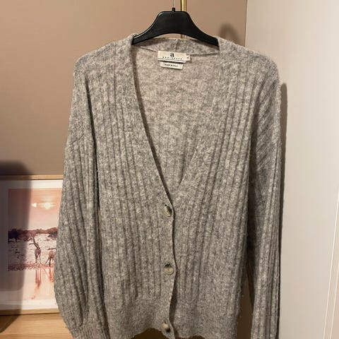 Arnie Says cardigan i beige farge, størrelse XXS. Laget av myk alpakka ull med glidelås foran og lommer på sidene. Stor i størrelsen.