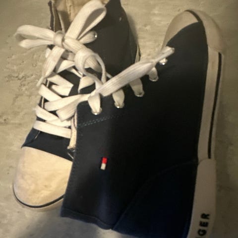 Diesel unisex sneakers i størrelse 32 med svart og hvit farge. Skoene har høy ankel, snøring foran, og tydelig logo på siden og bak. Sålen er hvit med røde detaljer og tekst. Passer for barn.