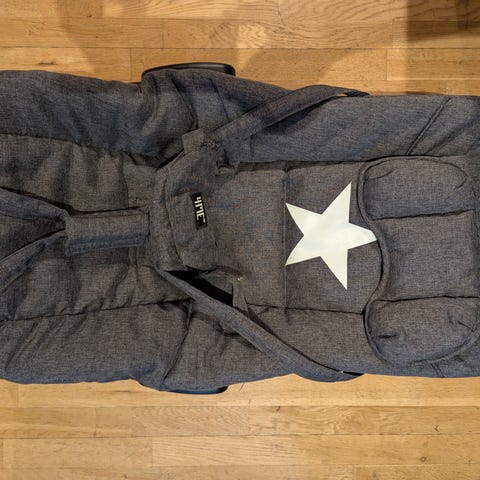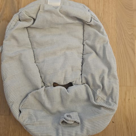Nyfødt del til Stokke barnestol med grå trekk dekorert med hvite stjerner. Trekket inkluderer polstring og sikkerhetssele med stropper. Den er vaskbar og veldig praktisk