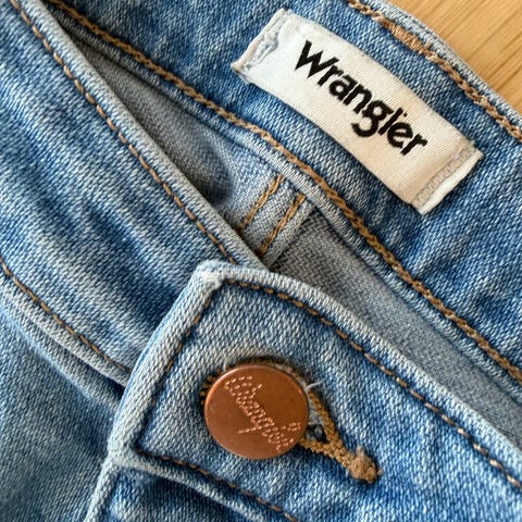 Wrangler Flare jeans for kvinner i blå farge, størrelse XS med midjevidde W27. Laget av denimmateriale, designet med klassisk femlommers stil og flare ben.