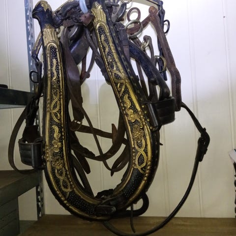 Antikk komplett bogtresele med reimer og puter, messingbeslag, hesteutstyr