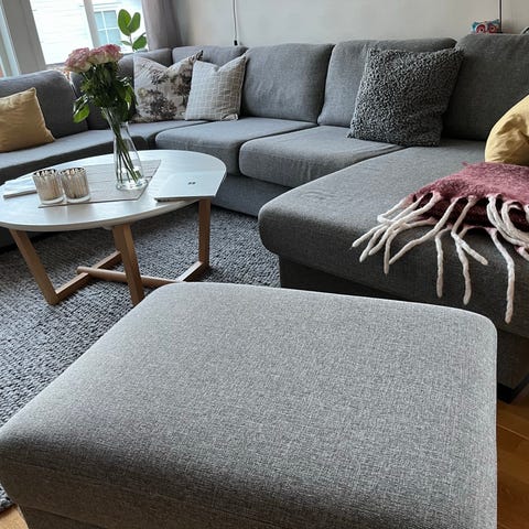 Nyrenset Modulsofa i lyse grå, ullstoff, lite og pent brukt, stått i «kjellerstue». Kjøpt ny i 2014. 310 cm høyre, 210 cm venstre.