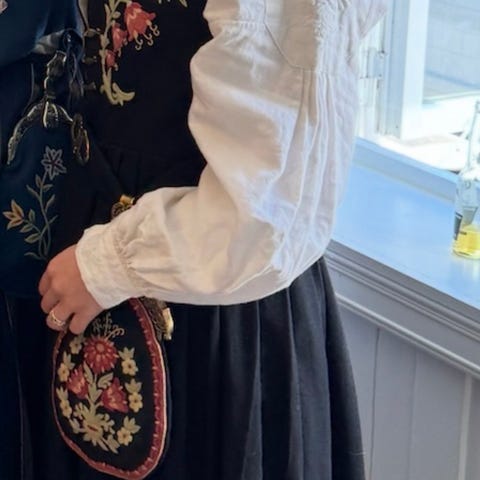 Stakk, skjorte, stoffbelte, sjal, veske med tilhørende sølv, ( ikke sølvbelte) underskjørt, bunadpose, og hårbånd.