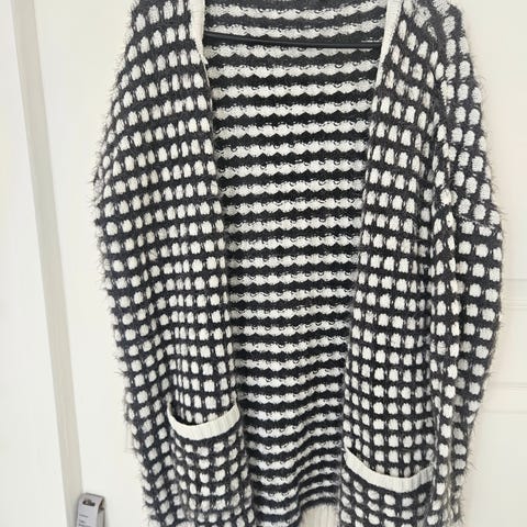 Lang grå cardigan i str 38. Pent brukt, god og varm.