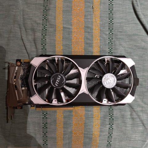 Selger skjermkort MSI GeForce GTX 980 Ti Gaming 6G 384 bits med 6 GB RAM GDDR5 i original eske. Utmerket stand, alt fungerer som det skal. Aldri overklokket, brukt kun til gaming.