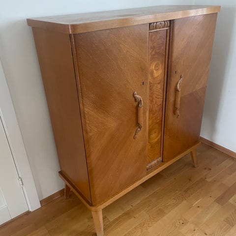 Vintage sjeldent skap i tre med 4 skuffer og helt spesielle skyve skapdører. Inkluderer en nedfellbar skapdør til å sette pynte gjenstander og en glasshylle med speil bak til oppbevaring av service/barskap mm. Passer til oppbevaring i stue, 5 uttrekkbare skuffer på venstre side til spisebestikk mm. VHøyre side 4 hyller derav 2 uttrekkbare. Materiale i tre og glass hylle med metall oppheng i midten med lys.