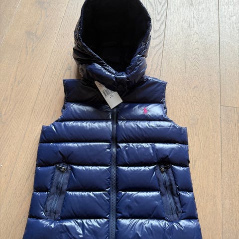 Polo Ralph Lauren barnevest i størrelse 92, unisex modell. Vesten er rød og har detaljer som logo brodert på brystet og merkelapp på lommen. Egnet for barn og kan brukes som et lag for ekstra varme.