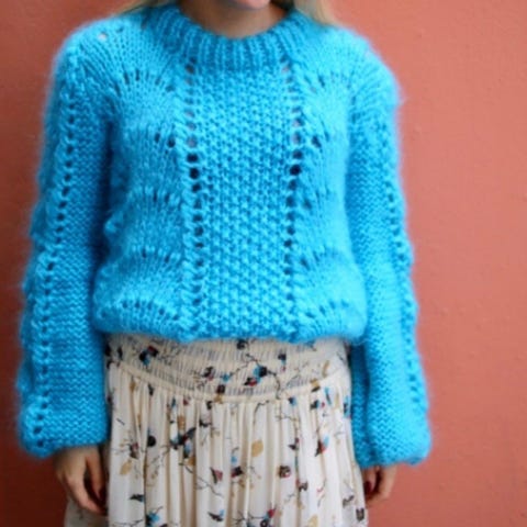 Egenkomponert oppskrift! Kan minne om en krysning av The Juliard Mohair fra Ganni og Sommerfryd fra Knitteriet kanskje. Håndstrikket genser med ballongermer, åpen rygg og silkebånd. Silkebåndet kan enkelt byttes ut med ønskelig farge hvis vil variere.