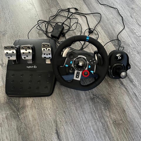 Logitech G29 Racing Wheel og Pedaler med ratt, to pedaler (gass og brems), og innebygde kontrollknapper. Svart farge, laget for bruk med racing spill på PC og konsoller. Materiale inkluderer lær på rattet for bedre grep og metall på pedalene for holdbarhet.
