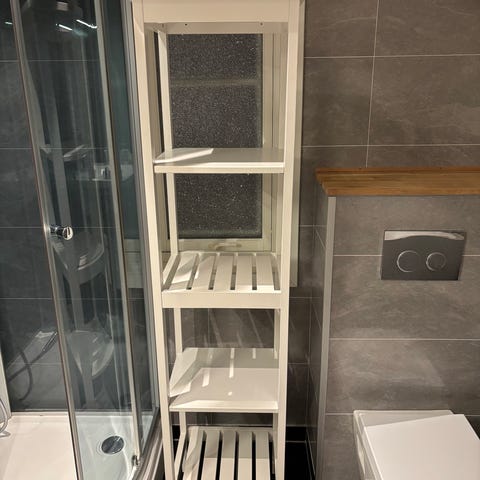 hyllen egner seg for oppbevaring av ulike gjenstander i hjemmet, for eksempel klær, håndklær eller andre husholdningsartikler. Passer til bruk i vaskerom, bod eller andre rom som trenger ekstra lagringsplass.