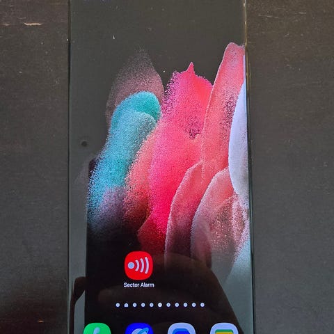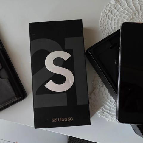 Samsung Galaxy S21 Ultra mobiltelefon med 128 GB lagringskapasitet og 12 GB RAM. Fargen er Phantom Silver. Modellen er SM-G998B/DS og er produsert i Vietnam. Telefonen har flere kameraer på baksiden og en stor skjerm på forsiden. Telefonen er i utmerket stand, både teknisk og visuelt, fra første dag, med en beskyttelsesfilm som aldri har blitt fjernet. Visuelt ser den nesten ut som ny. Den har blitt brukt svært forsiktig. Batteriet holder godt på ladningen. Settet inkluderer telefonen, et fint herreveske og originalemballasjen. Laderen er ikke inkludert. Utmerket pris for en slik telefon, så ingen pruting.