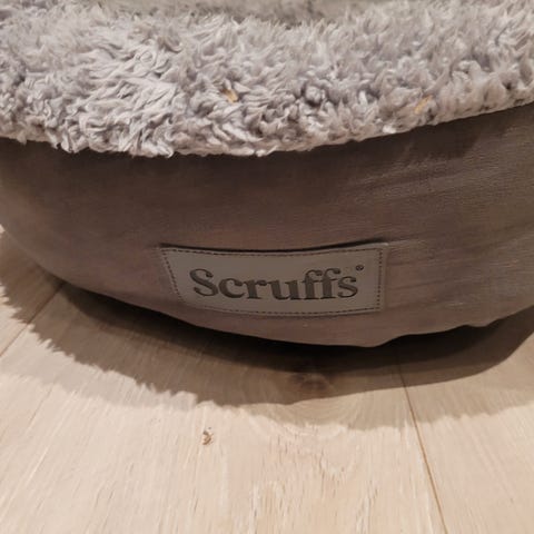Scruffs hundeseng i størrelse 75x60 cm selges. Svært lite brukt og fremstår som ny. Inkluderer folie lag for varmeisolasjon og fyll av resirkulert fiber. Farge: svart og grå med røde detaljer.