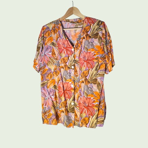 Nydelig vintage bluse med fargerikt og unikt mønster i blå, grønn, rød og gul. Lett og luftig stoff som faller fint – perfekt både til hverdags og fest!
