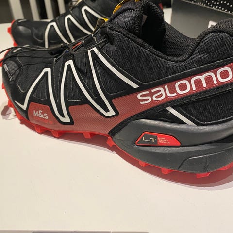 Salomon løpesko i størrelse 46 2/3, designet for løping, tur og terreng. Skoene har en svart og rød fargekombinasjon, med materialer som gir støtte og komfort ved løping. Har vasket dem rene skånsomt med mikrofiber og klut. Nylig impregnert. I veldig fin stand generelt vil jeg si. Men har litt slitasje i den ene hælen. Selges fordi det ikke passer så godt foran med mine sko.