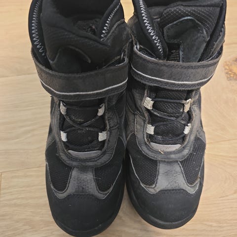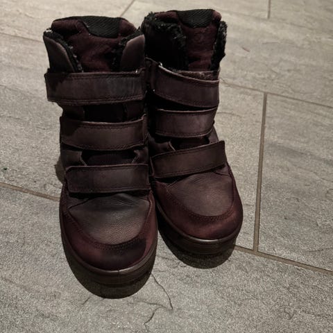 ECCO vintersko i størrelse 34. Skoene har en kombinasjon av rosa og svart farge, med borrelås for enkel justering og påkledning. Yttersålen har mønster for godt grep.
