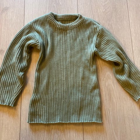 Ribbestrikket ullgenser med glidelås i halsen.