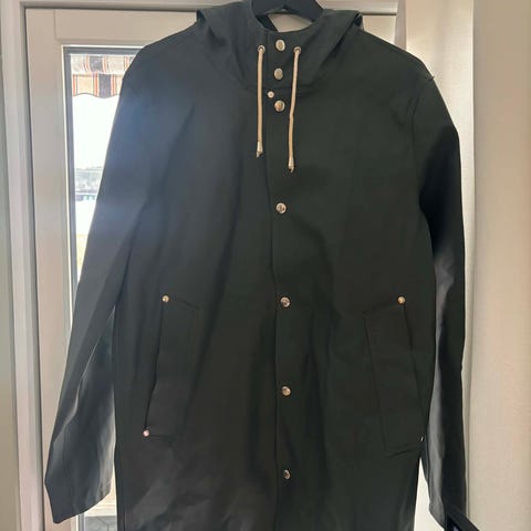 «Stockholm, our home and your essential wardrobe staple is a straight-fit raincoat in sturdy and hard-wearing waterproof fabric. Expertly made, it’s tailored with double-welded seams for complete protection against the rain. The drawstring hood and under-arm eyelets add ease of movement and comfort in uncomfortable weather.»