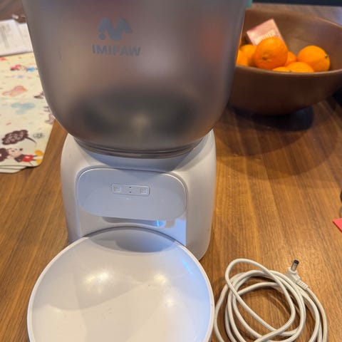 Selger mat- og drikkeautomat i plast med metallskål. Drikke automaten har en plastflate som fanger dyrehår. Vannet fylles automatisk når den går under et visst nivå. Matautomaten har en luke på fremsiden som enkelt kan åpnes for å fylle matskålen.