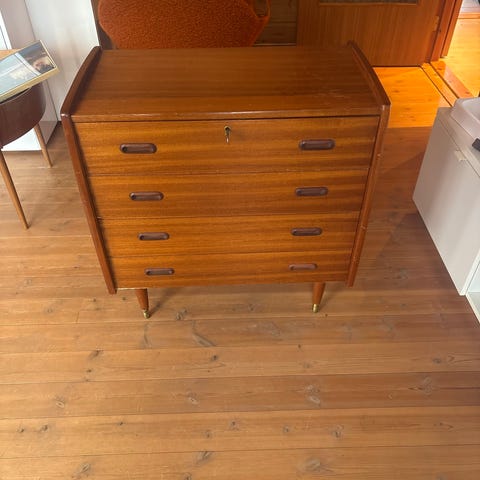 Teak kommode med 6 skuffer og 2 nattbord selges. En skade på en skuff på kommoden, noen bruksmerker. Skuffene har finerbunn. Selges samlet for kr 4000 eller bud. Har også 2 enkeltsenger i samme serie til salgs. Kan være behjelpelig med levering.