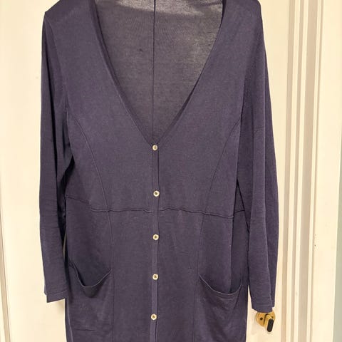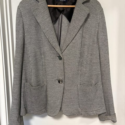Meget elegant blå blazer for dame i størrelse L/XL (str 25)Jakken har en knapp foran, to lommer med klaff og en glatt, ensfarget overflate. Ull og silke(se merkelapp) Jakken har et klassisk snitt med krage og er egnet flere anledninger.