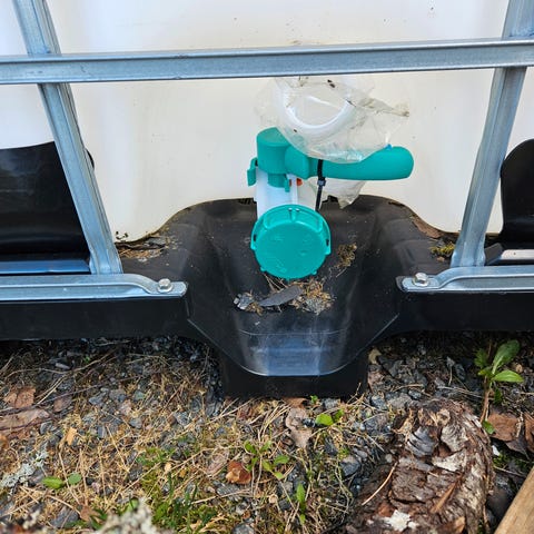 IBC Tank med kapasitet på 1000 liter, laget av plastmateriale med metallramme for støtte og beskyttelse. Tanken har en toppåpning med skrukork og en tappeventil i bunnen for enkel påfylling og tapping. Egnet for lagring og transport av væsker. Fargen på plasttanken er hvit, og metallrammen er grå. Tanken er rektangulær og plassert på en palle for stabilitet ved håndtering.