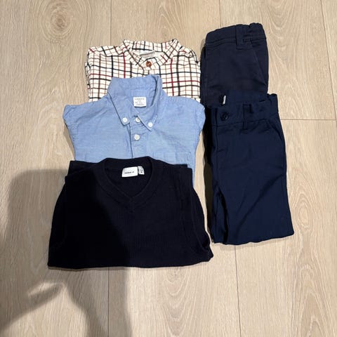 To pene, kortermede skjorter str. 110, en pen shorts str. 104 (men romslig, synes jeg), og en helt ubrukt sixpence med lappen fortsatt på fra Newbie, str. 52/54.