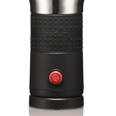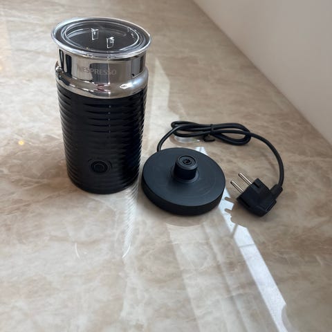 Elektrisk melkeskummer fra Nespresso med base og to forskjellige skummere. laget av rustfritt stål med avtakbare deler for enkel rengjøring . Under et lite lokk oppbevares den andre skummeren. . Den skummer både varmt og kalt. Strømforsyning via ledning med støpsel.