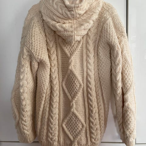 Selger en flott tykk og varm strikkejakke med hette .