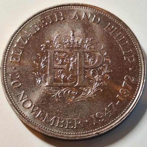 Storbritannia 1981 kronemynt med portretter av Prins Charles og Lady Diana på forsiden, og dronning Elizabeth II på baksiden. Mynten er laget av metall og har samleverdi.