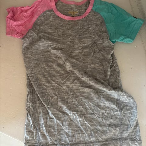 T-skjorte i 100% merinoull og ulltrøye med glidelås i 80% ull og 20% polyamid selges samlet for 90 kr. Pent brukt. Str 12 år