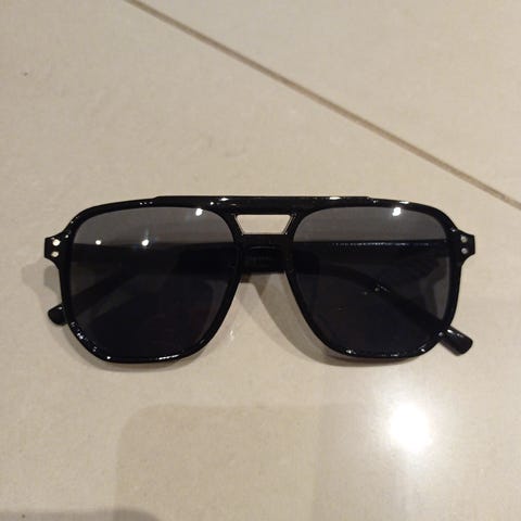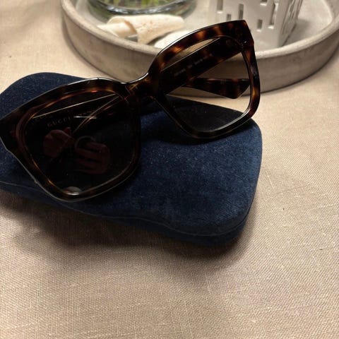 solbriller for dame med store, rektangulære rammer. Solbrillene har mørke glass og dekorative detaljer på sidene. Materialet er plast, og designet er laget for å gi god dekning og beskyttelse mot sollys.